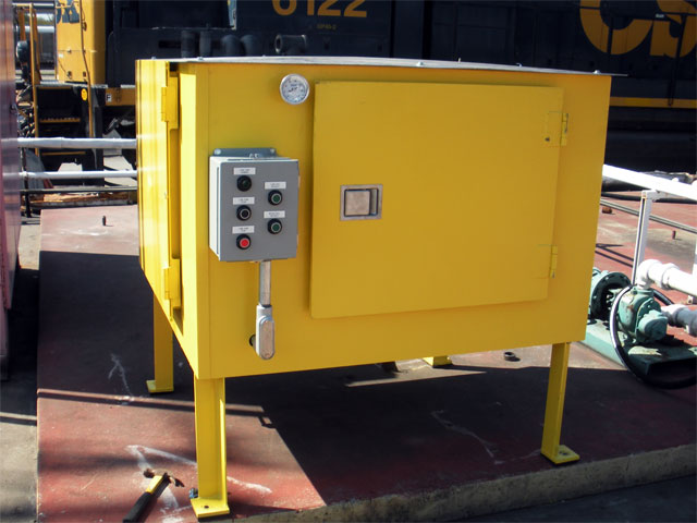 A heated cabinet has many functions in a rail yard. CWI has built insulated and heated operator accessible cabinets for water, treated water, lube oil, and many combinations of oil and water. Over the years we have standardized on four types; single reel Platform cabinet, dual reel Platform cabinet, suspended and platform mounted multi-reel Locomotive Accessible cabinets. CWI builds extremely rugged cabinets because this is the point where the operator interfaces with the equipment. These units have to be both ergonomically correct and tough enough to withstand the harsh everyday use that a Locomotive Service Center puts on a piece of equipment.